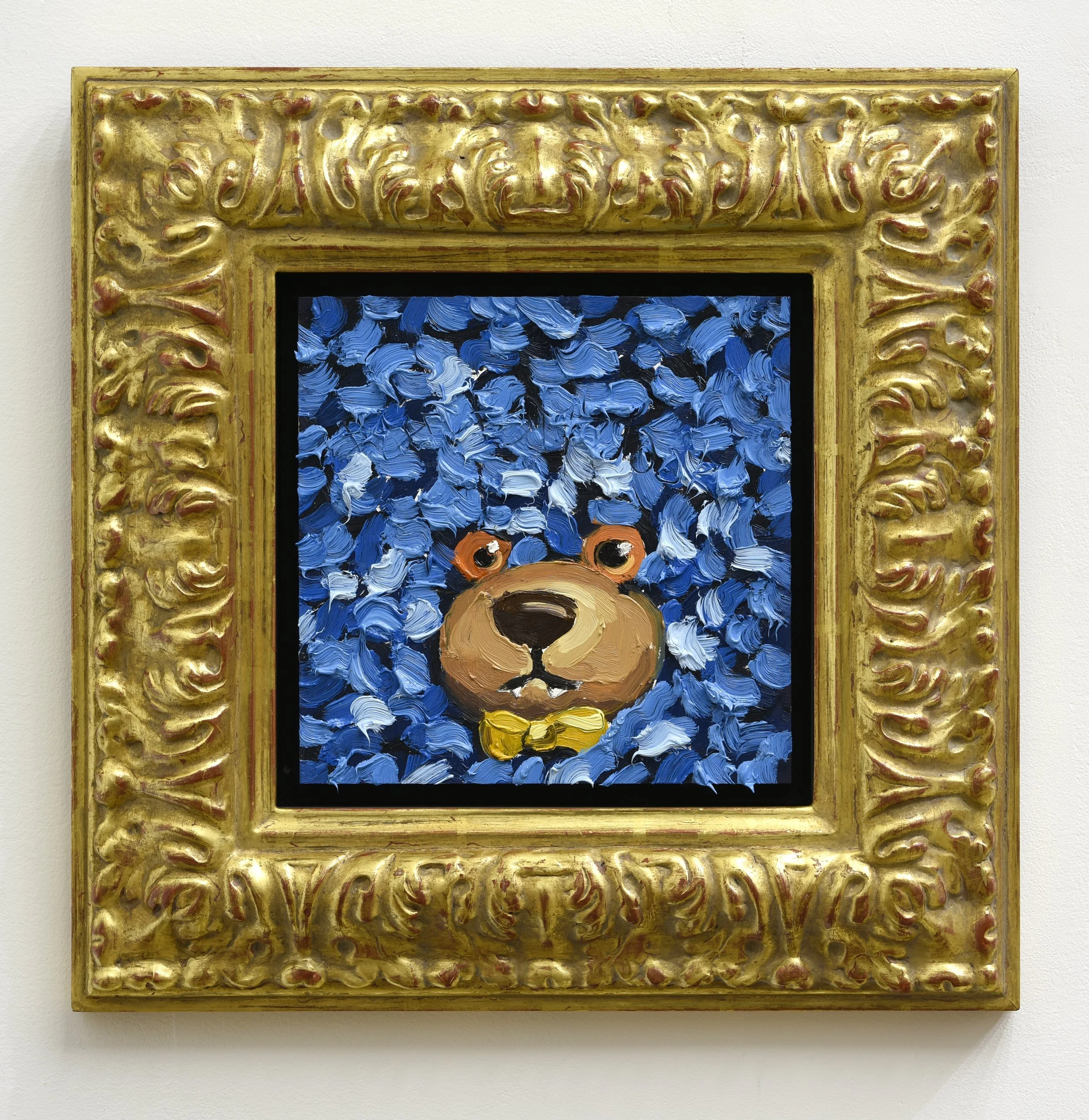 I had initially picked orange for the color of the bear’s eyes as a complement to the saturated blue of the fur, and this in turn gave him a nice spooky feel which led to the eventual title. That is one of the magical aspects of the Fur Faces series, the process of painting them will often lead me in an unexpected direction and create a wholly unique story that I could have never planned out. In the case of Bearula, not only did it yield a character that is unlike any other of the Fur Faces, but it also lent itself to a number of little tactile painterly moments, like the quick peaks of paint that droop over the bottom edge of the piece, blurring the lines between the pictorial world into our own.