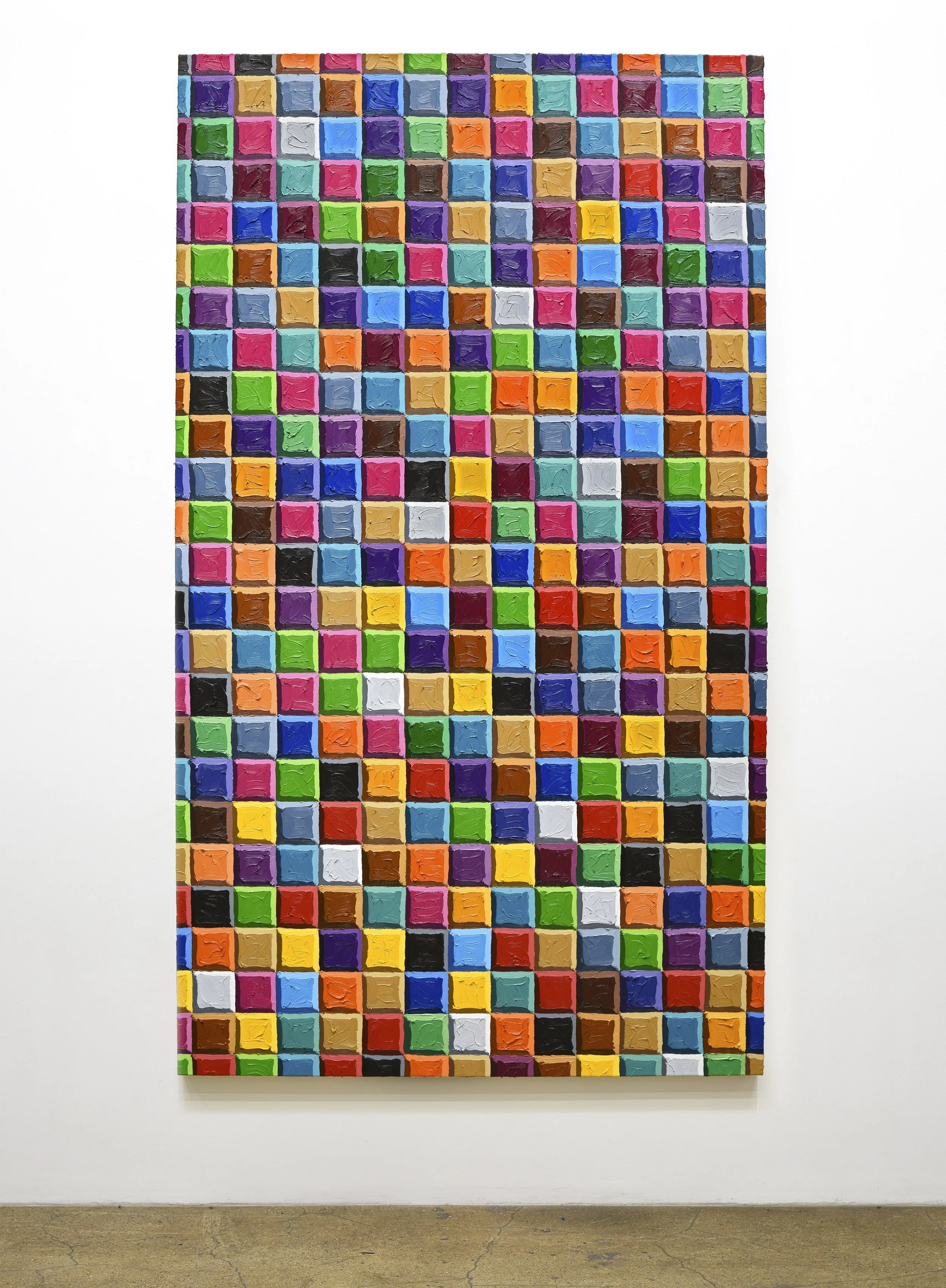 One of my personal favorites from the Square Quilt series is Life is Going to be Good, a seven-foot-tall vertical grid of over 300 squares. Each square contains three values of the same color: a base color for the face of the square, a lighter tint of that color for the beveled highlight at the upper-right, and a darker shade at the beveled lower-left edges.