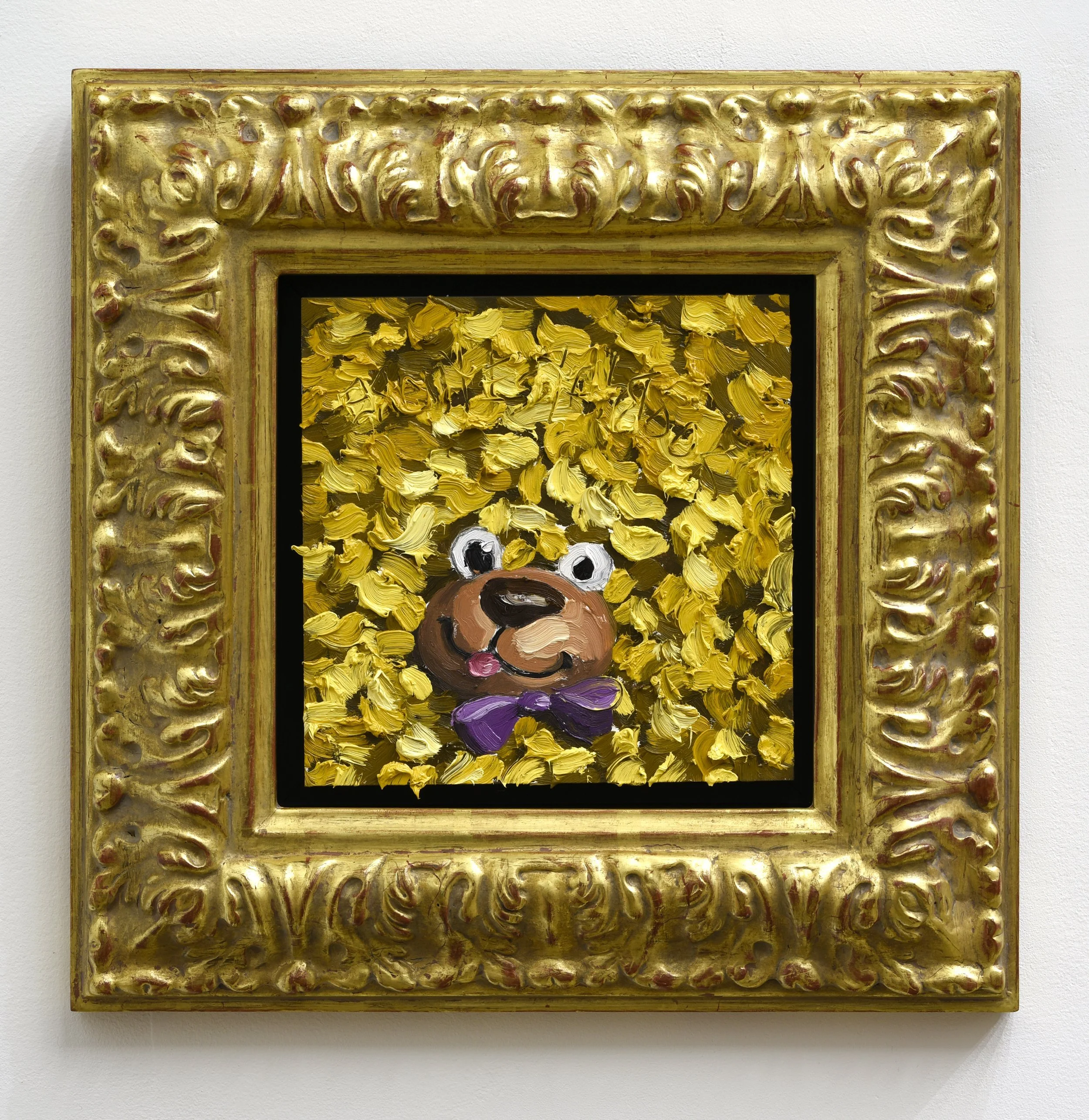 Lucky Golden Fur has a lovely luxurious color palette: a field of warm yellow surrounds a light chocolate-brown teddy bear face and a complementary purple bow, which nestles into the golden yellow brushstrokes around it and visually helps turn them from abstract marks to a gestural depiction of fur.