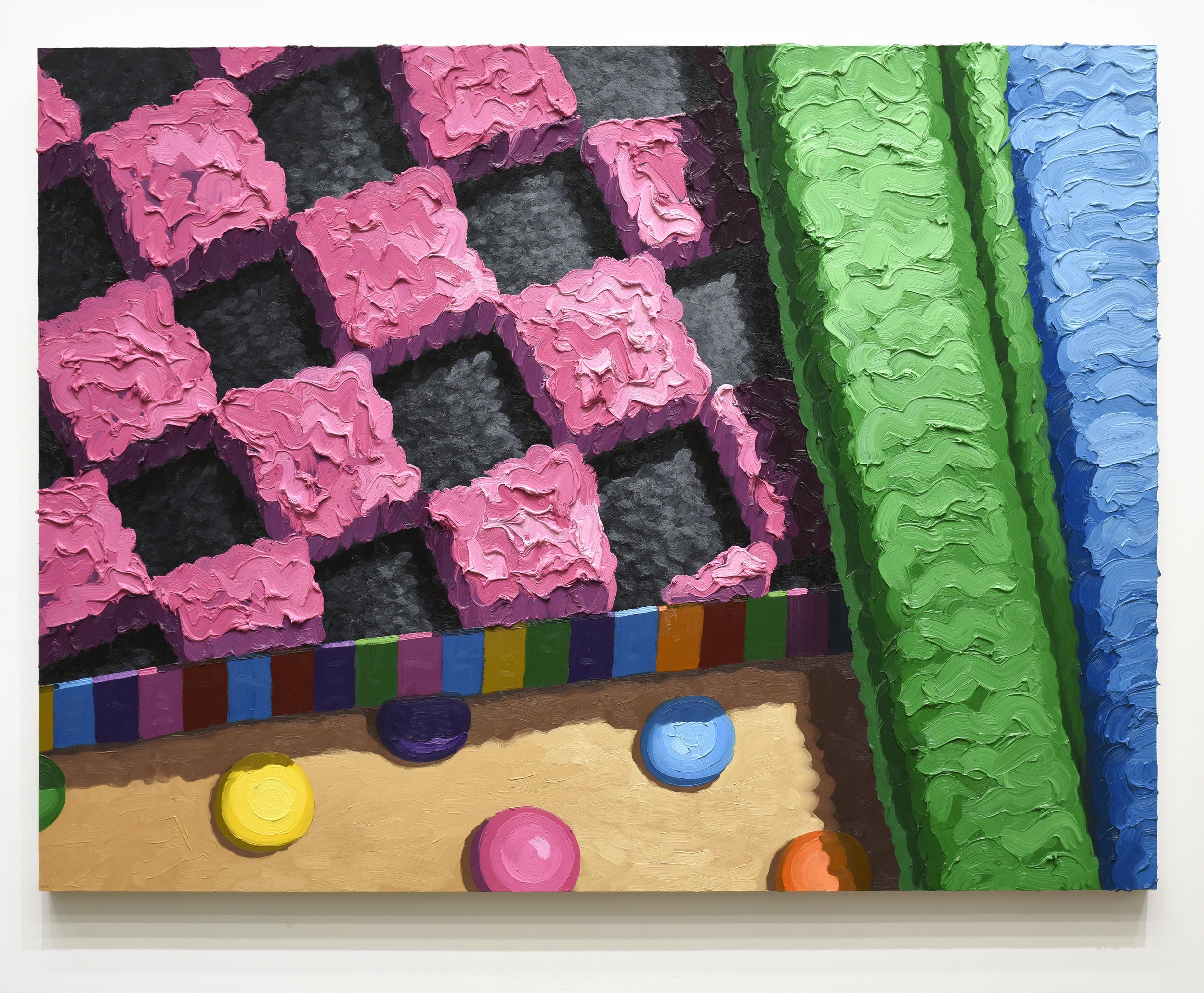 Sex in the Studio started out as a loose study for the large-scale diptych You Name It, and while the two may perhaps exist in the same pictorial universe, both pieces are unique worlds in their own right. My only goal for this painting was to make something intuitively playful, and I allowed my instincts to inform each subsequent markmaking decision, painting exclusively what felt right in that moment. The energetic liveliness that possesses the piece is the result of allowing the painting to guide me instead of being its rigid architect. The decadent checkerboard of pink and black, the multicolored striped edge running beneath it, and the various other shimmering and flexuous planes of color all came together in a way that I could not have planned out but that in the end feels exactly right.