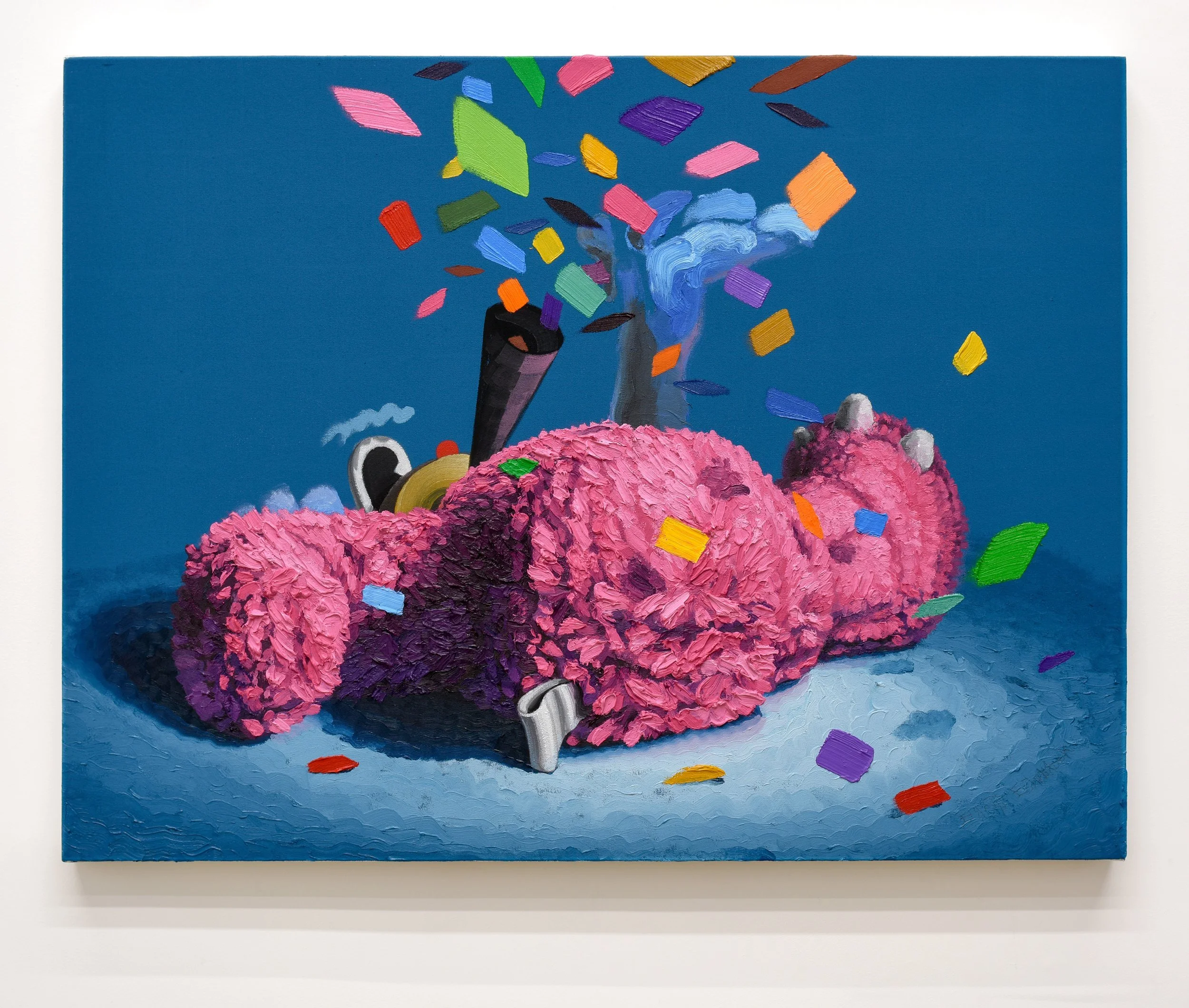 Third Time’s a Charm is the third painting I created in my Crazy Stuffed Animal series. As soon as I had placed the last stroke of paint, I felt a sense of celebration… all the elements of the piece came together in a perfect way, and even looking back at it now I would not change a single thing about it. The work is the perfect mixture of recognizable realism, such as the crisply rendered faux fur foot and the sliver of folded silver ribbon, and the imaginary world, manifested through the cloud-like floating hand and the dreamy explosion of flat-color confetti.